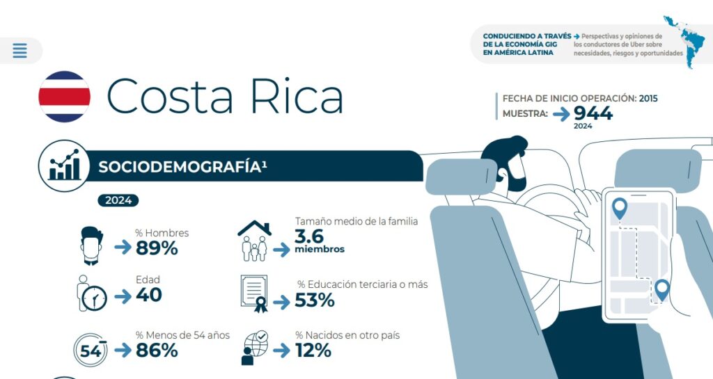 El análisis del BID muestra que en Costa Rica el 89% de las personas que trabajan “haciendo Uber”, son hombres. El 53% tiene educación más allá de la secundaria como los diplomados, bachilleratos o licenciaturas en centros técnicos, universitarios o parauniversitarios.