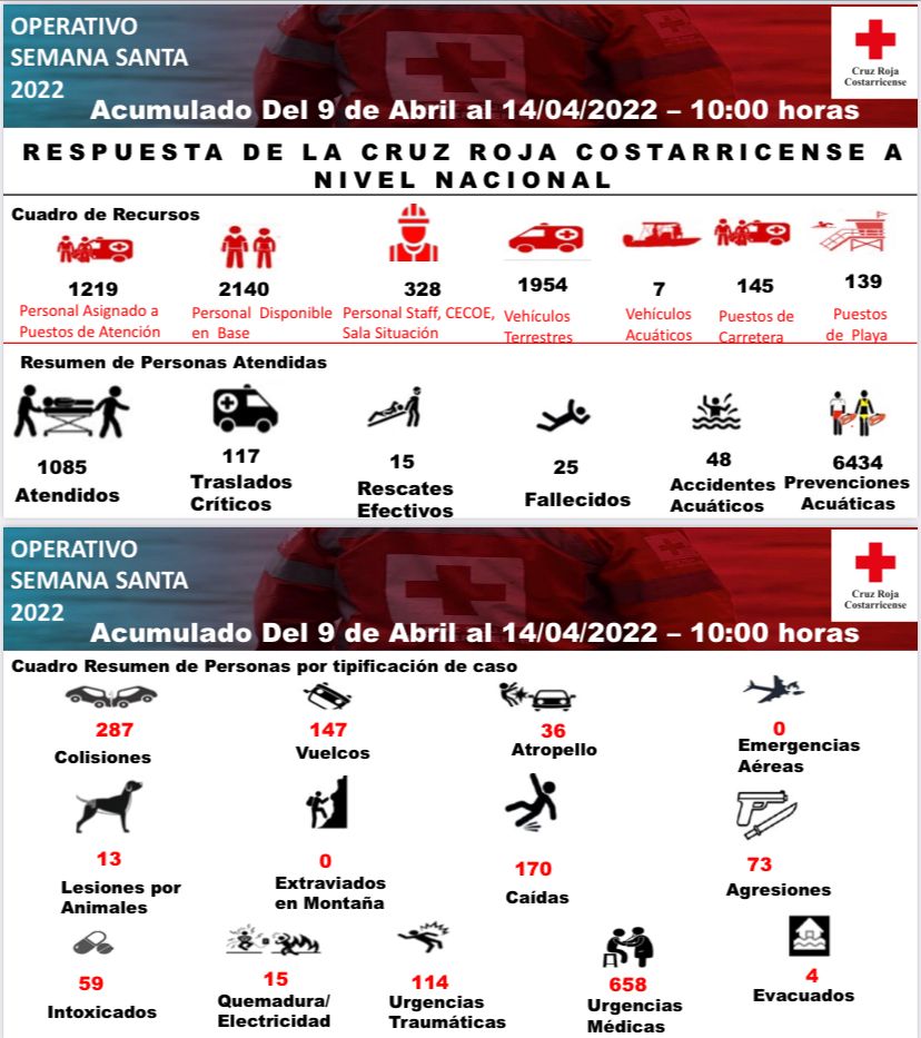 En el caso de la Cruz Roja, desde el 9 de abril hasta este jueves 14, se suman casi 500 atenciones entre colisiones, vuelcos y atropellos; y en cuanto a incidentes acuáticos se han reportado 48, además de casi 6.500 prevenciones.