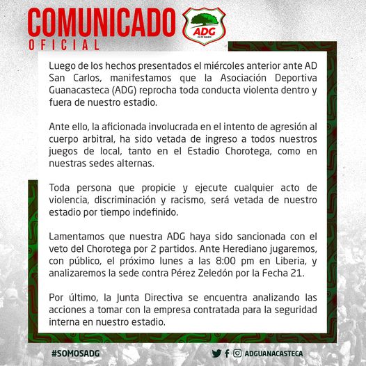 El Tribunal Disciplinario de la Federación Costarricense de Fútbol (FCRF) sancionó a la Asociación Deportiva Guanacasteca (ADG) con una multa de 205.000°° colones y el veto de uso del estadio Chorotega de Nicoya para sus próximos dos partidos de local, de conformidad con lo establecido en el artículo 73 inciso 1 y 3, por la invasión agresiva de una de sus aficionados y la materialización de una agresión a uno de los oficiales de partido.