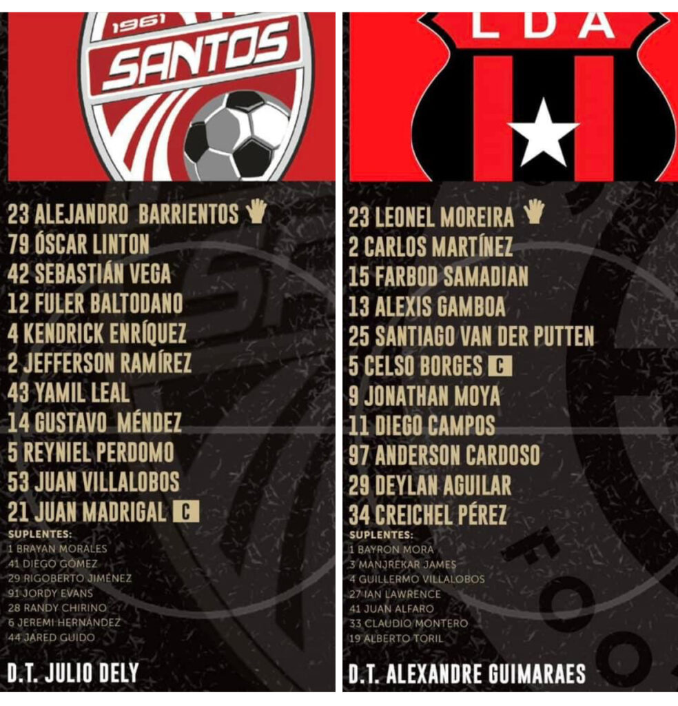 Por Santos Óscar Linton no pudo (tapó Moreira), Randy Chirino concretó, Juan Diego Madrigal hizo gol, Reynel Perdomo sacudió la red, Jeremy Hernández fulminó, Sebastián Vega fracasó (paró Moreira): 4.