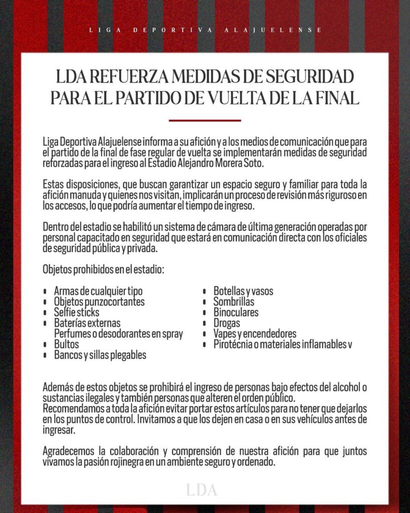 Para este sábado las medidas de seguridad para ingresar al estadio de los manudos aumentaron, “por lo que en la entrada de acreditaciones habrá personal de seguridad inspeccionando que no ingresen objetos o sustancias no permitidas”, informó LDA en comunicado de prensa.