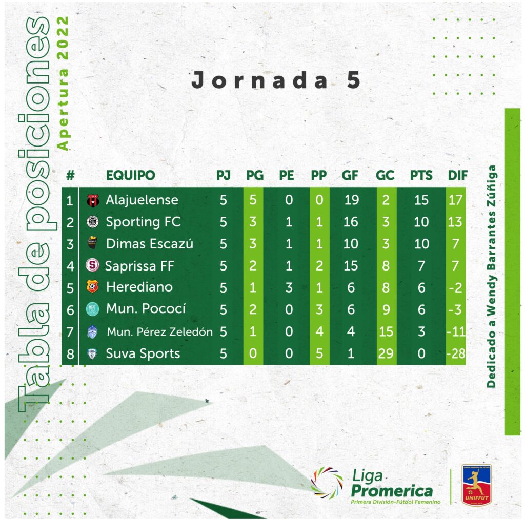 Dimas tiene 10 unidades, las mismas que tiene Sporting, pero las capitalinas poseen una mejor diferencia de goles. Las de Escazú no anotaron ante las florenses en su último partido y en la fecha anterior cayeron contra Pococí 2-1, por lo que los rivales se les están acercando.