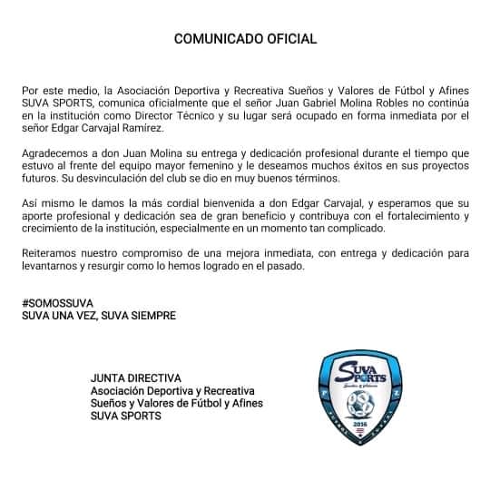 “Agradecemos a don Juan Molina su entrega y dedicación profesional durante el tiempo que estuvo al frente del equipo mayor femenino y le deseamos muchos éxitos en sus proyectos futuros. Su desvinculación del club se dio en muy buenos términos», mencionaron en el comunicado de prensa.