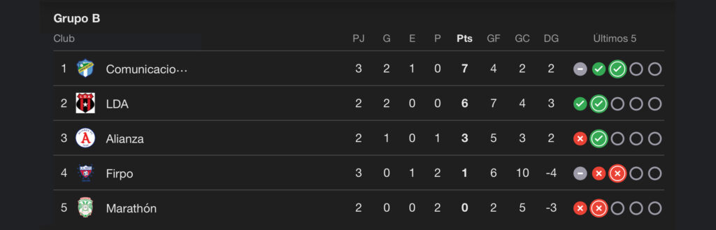 El Grupo B lo comanda el Comunicaciones de Guatemala con 7 puntos en tres juegos. Alajuelense le sigue con 6 unidades en dos choques y el Alianza lleva 3 en dos, por lo que el compromiso es crucial.