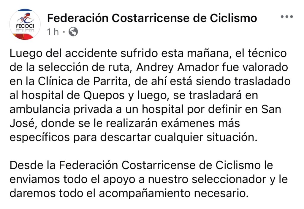 LA FEDERACIÓN COSTARRICENSE DE CICLISMO EMITIÓ UN COMUNICADO OFICIAL, EN EL QUE EXPLICA QUE ANDREY AMADOR SE REALIZARÁ MÁS EXÁMENES UNA VEZ SEA TRASLADADO DE LA CLÍNICA DE PARRITA A UN HOSPITAL POR DEFINIR EN SAN JOSÉ.