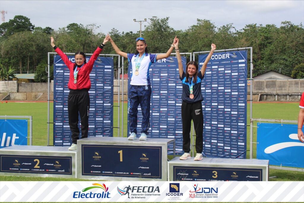 La foto de la primera premiación de los Juegos Nacionales Provincia de Limón 2026, correspondiente a la prueba de marcha atlética de 10 mil m U20 femenino, celebrada este martes 13 de enero en el Polideportivo de Siquirres. Oro, Chelsea Yuliana Araya de Pérez Zeledón (57.33); plata, María Celeste Granados de Palmares (1.01.02), y bronce, María Valeria Gómez, de Paraíso (1.04.11).