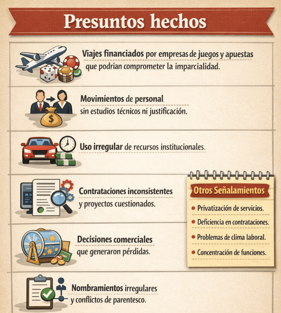 Además, se denuncian presuntos movimientos de personal sin estudios técnicos previos ni justificación administrativa, «lo cual podría vulnerar los principios de mérito e idoneidad y legalidad en la gestión de recursos humanos», entre otros.