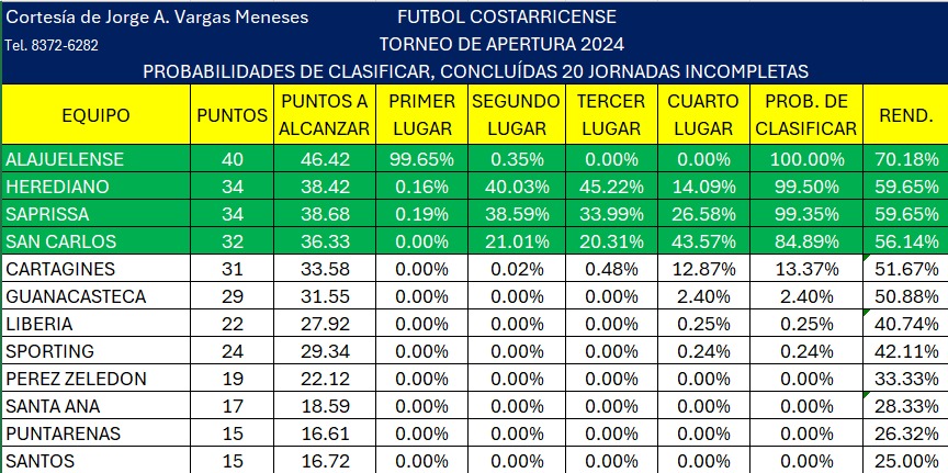 Herediano y Saprissa tienen 99,5% y 99,35% de opciones de avanzar a semifinales y el cuarto boleto se va perfilando para San Carlos con un 84,89%, aunque Cartaginés, Guanacasteca también tienen esperanzas, reducidas, pero las tienen al fin y al cabo.