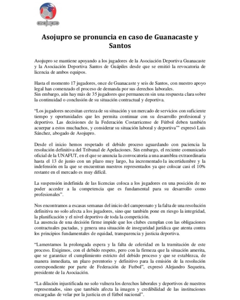 “Hasta el momento 17 jugadores, once de Guanacaste y seis de Santos, con nuestro apoyo legal han comenzado el proceso de demanda por sus derechos laborales. Sin embargo, aún hay más de 35 jugadores que permanecen sin una respuesta clara sobre la continuidad o conclusión de su situación contractual y deportiva”.