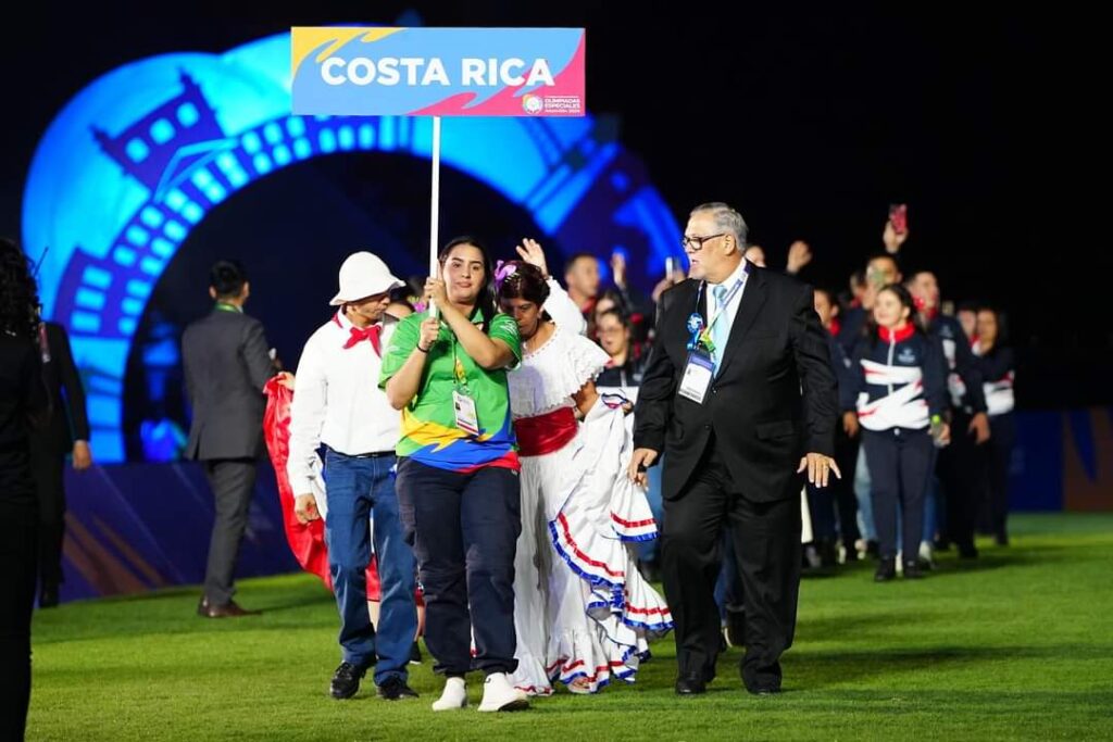 Zeikate encabezó el desfile por el césped del estadio junto al Presidente de Olimpiadas Especiales Costa, Carlos Valverde y cuatro atletas quienes lucieron trajes típicos.
