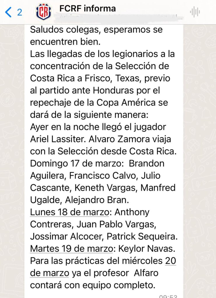 Según detalló la Federación Costarricense de Fútbol, Navas se incorporará a la Tricolor el próximo martes 19 de marzo en Frisco, Texas; mientras que Ariel Lassiter llegó desde el sábado y Álvaro Zamora trabaja desde el pasado viernes, en Costa Rica. La selección sale del Juan Santamaría este domingo 17 de marzo, donde en la noche se encuentre en Estados Unidos con Brandon Aguilera, Francisco Calvo, Julio Cascante, Kenneth Vargas, Manfred Ugalde y Alejandro Bran. Mañana lunes llegarán al estado texano Juan Pablo Vargas, Anthony Contreras, Jossimmar Alcocer y Patrick Sequeira.