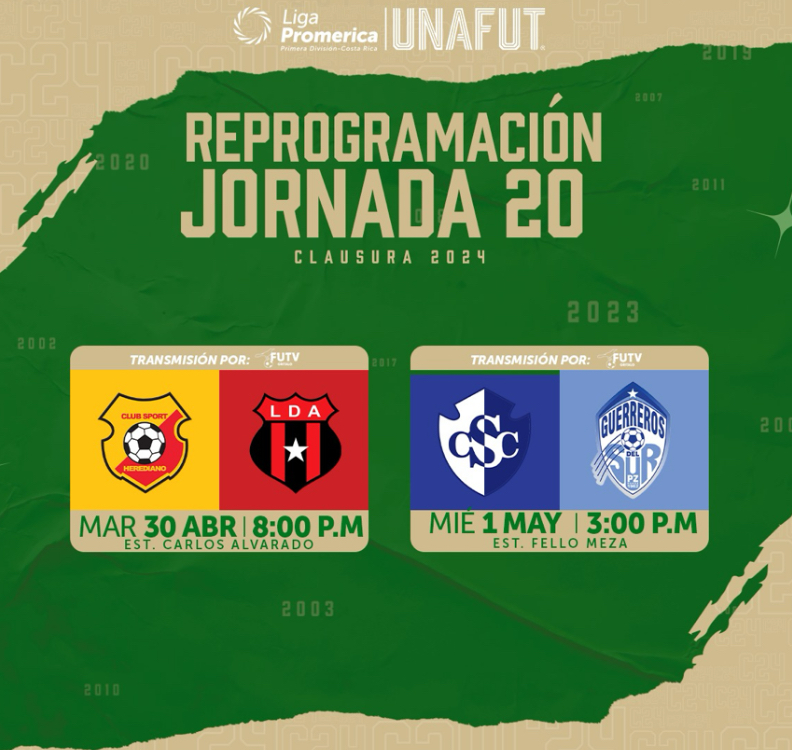 El Herediano vs. Alajuelense estaba programado originalmente para el pasado sábado a las 7pm. La Liga pidió posponerlo tras un cuadro estomacal que atacó a su plantilla y se reprogramó para martes a las 8pm. Aduciendo no estar 100% recuperados los manudos solicitaron otra posposición (a miércoles), a lo cual se opusieron los rojiamarillos. Competición se las rechazó y entonces se pensó que acudirían al Consejo Director de Unafut, idea que no habría cuajado porque a las 5.10pm el ente rector publicó la programación oficial: