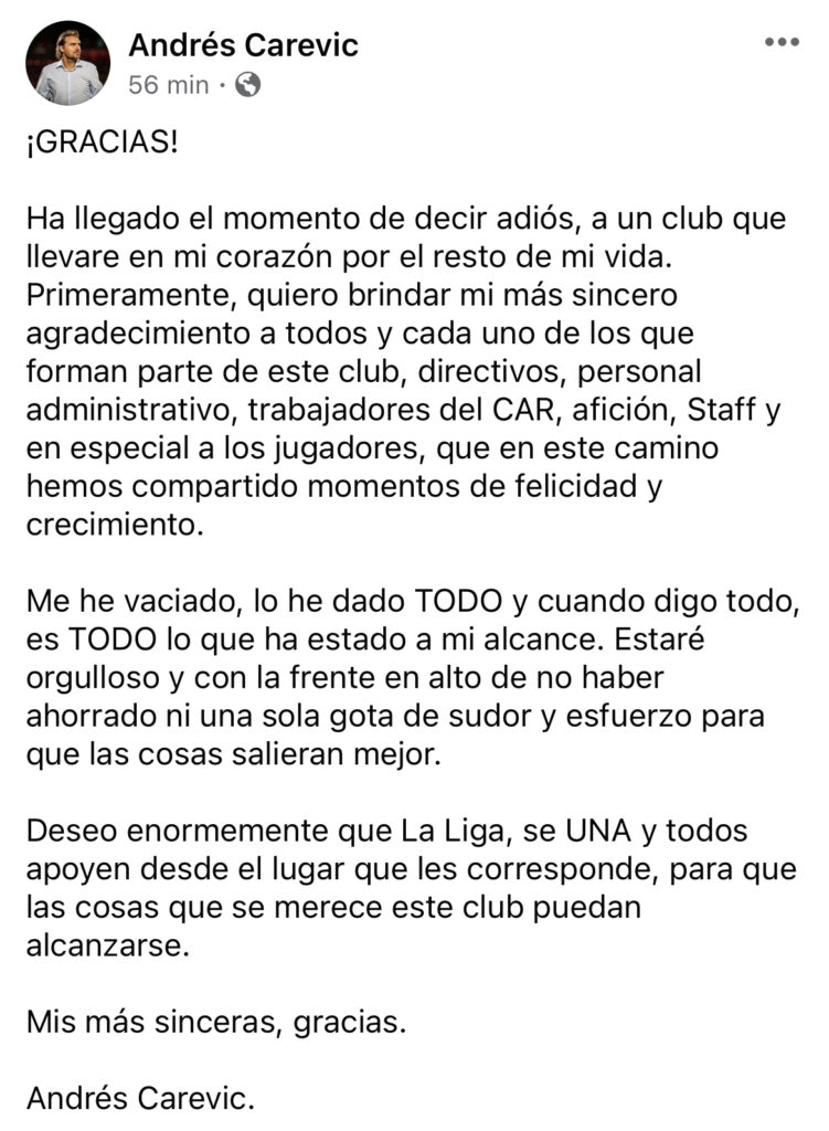 Mediante el siguiente post en su cuenta de Facebook él técnico Andrés Carevic se despidió de Liga Deportiva Alajuelense tras ser despedido la noche del jueves:
