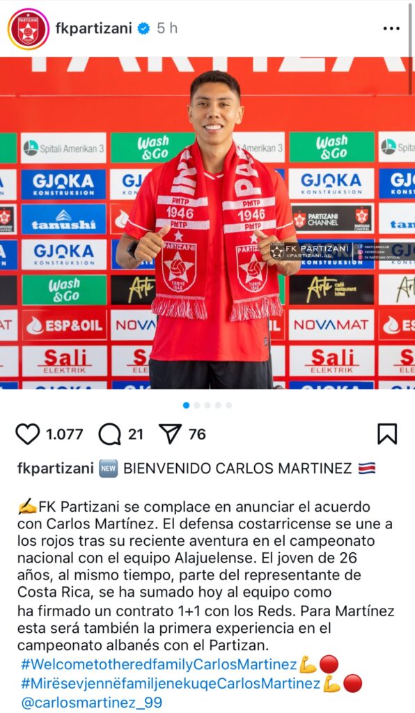 El Partizani de Albania fichó al lateral derecho costarricense Carlos Martínez, procedente de Alajuelense: