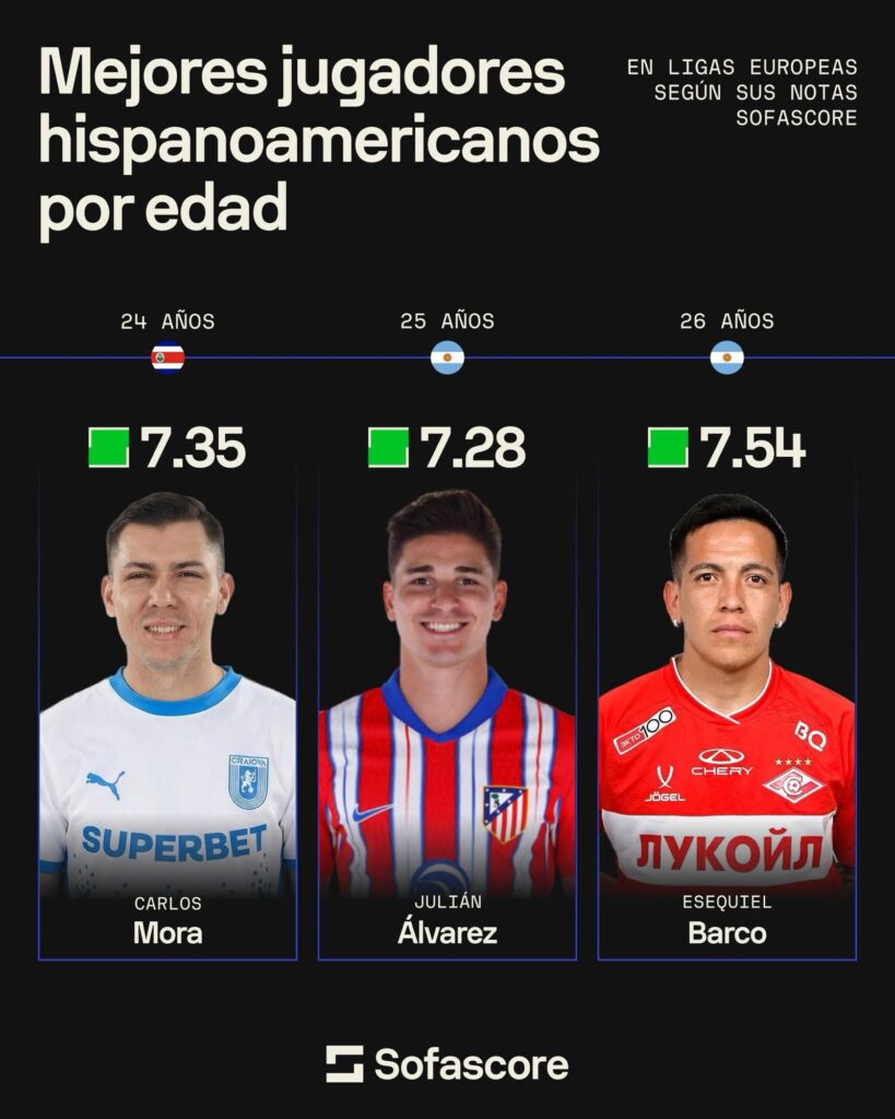 Sofascore, plataforma internacional especializada en estadísticas deportivas, elaboró un ranking con los jugadores hispanoamericanos mejor valorados de cada edad y que militan en el fútbol europeo.