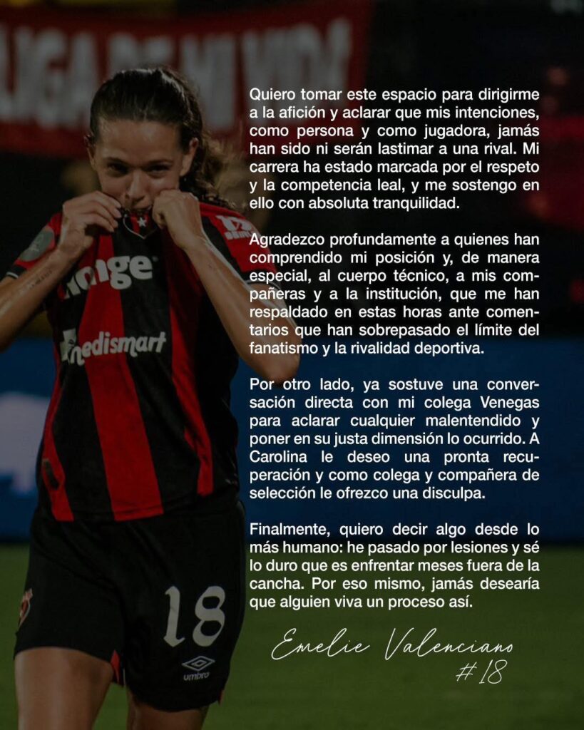 La futbolista de la Liga Deportiva Alajuelense, Emilie Valenciano, publicó en sus redes sociales una carta disculpándose por lo sucedido en el Clásico Nacional con Carolina Venegas.