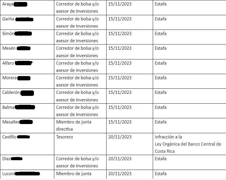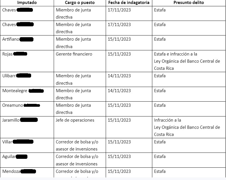 «En el desarrollo del caso, el 10 de junio del 2019 se indagó al imputado de apellidos Chaves Bolaños, en relación con los hechos aparentemente cometidos en perjuicio de cuatro de las 26 personas ofendidas apersonadas formalmente al proceso (entre personas físicas y jurídicas). En las diligencias recientemente realizadas, se amplió la indagatoria a este imputado, quien actualmente cumple las medidas cautelares de impedimento de salida del país, firmar cada dos meses y no acercarse a testigos y ofendidos», informó el Ministerio Público.