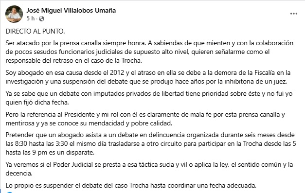 «Soy abogado en esa causa (La Trocha) desde el 2012 y el atraso en ella se debe a la demora de la Fiscalía en la investigación y una suspensión del debate que se produjo hace años por la inhibitoria de un juez», escribió.