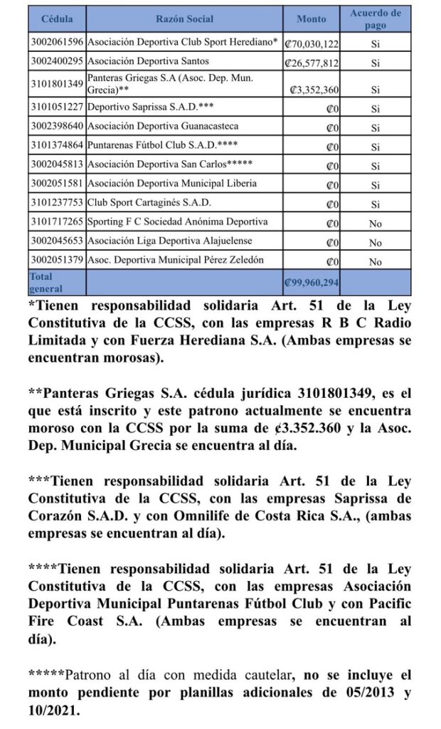 El licenciado Christian Guillen Gómez, director a.i. de Cobros de la CCSS, menciona que el monto adeudado por estos tres clubes es de ¢99.995.739 millones, de los cuales ¢70,030,122 corresponden al Club Sport Herediano, ¢26,577,812 a la Asociación Deportiva Santos de Guápiles y ¢3,352,360 al equipo Municipal Grecia.