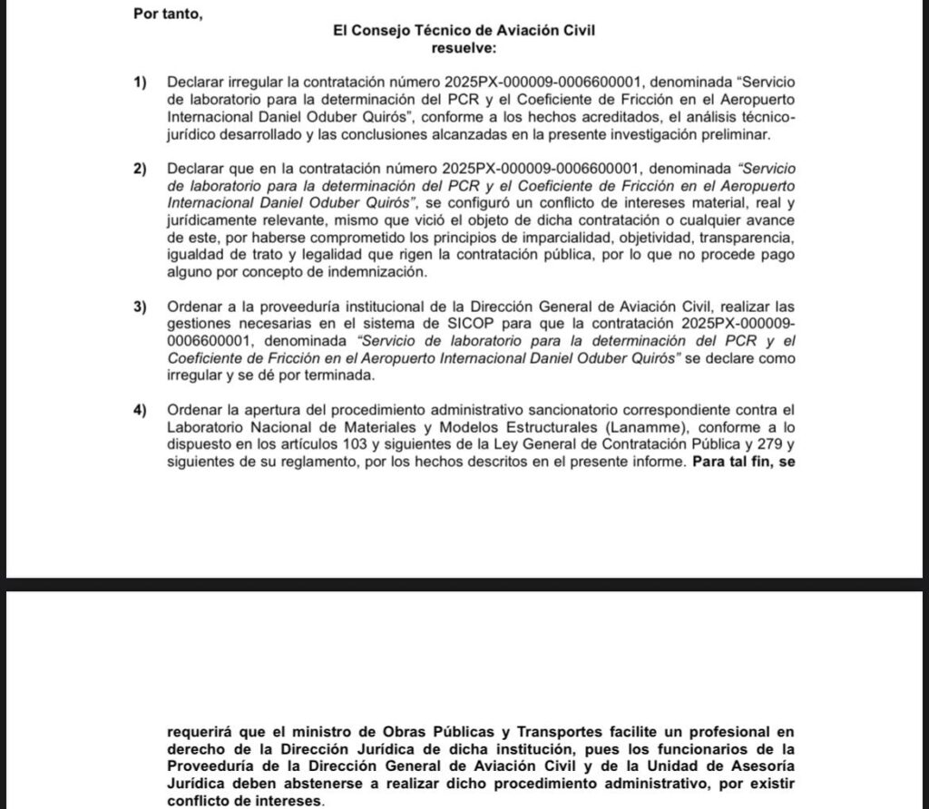 De acuerdo con la resolución N.° 035-2026, el CETAC declaró irregular la contratación para la medición del coeficiente de fricción y el PCR de la pista, y ordenó la apertura de un procedimiento administrativo sancionatorio contra el Laboratorio Nacional de Materiales y Modelos Estructurales (Lanamme).
