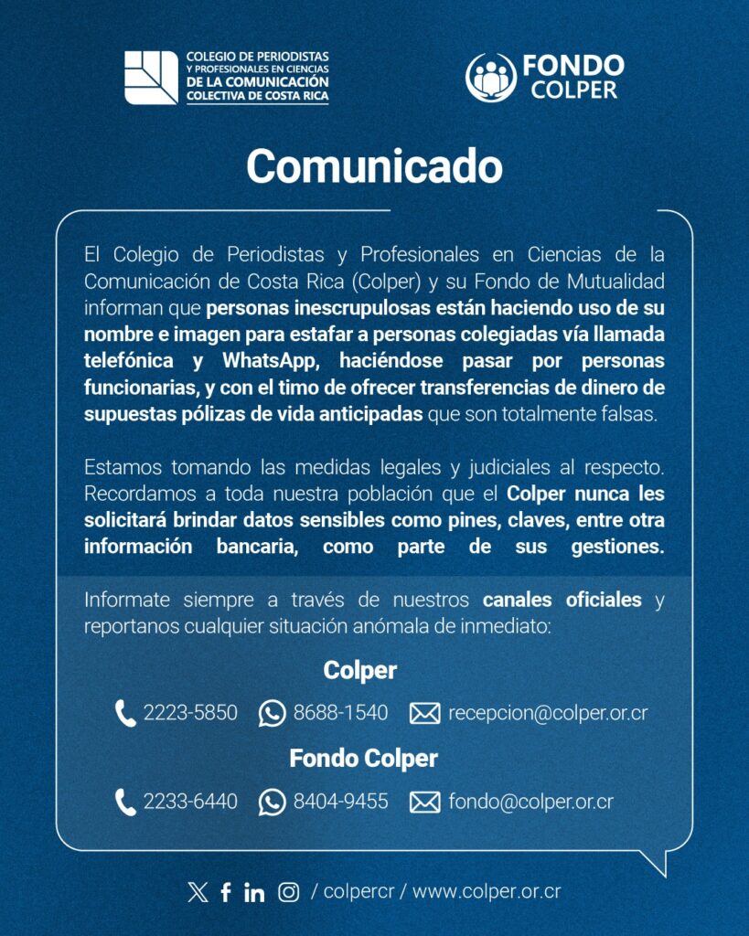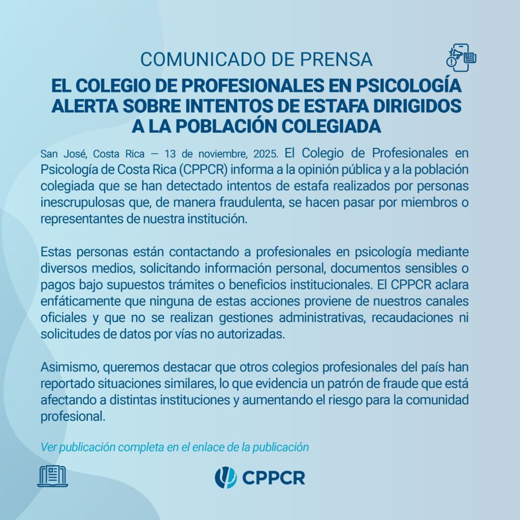 Esta semana otras el Colegio de Periodistas y el Colegio de Profesionales en Psicología circularon mensajes para advertir a sus agremiados de intentos de estafa usando el nombre de las instituciones.