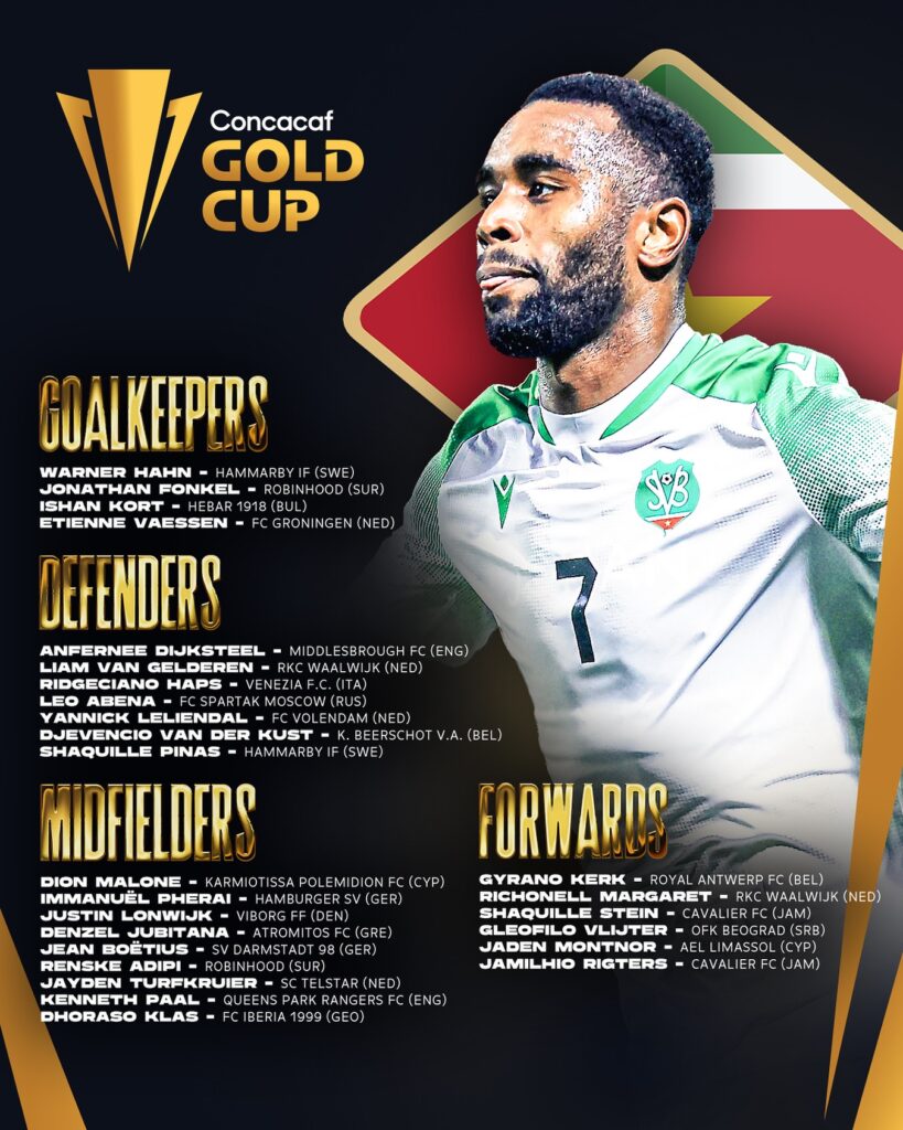 En la nómina de Surinam resaltan él y múltiples neerlandeses que se desempeñan en diversas ligas europeas de países como Países Bajos, Bélgica, Inglaterra, Suecia, Grecia, Alemania e Italia.