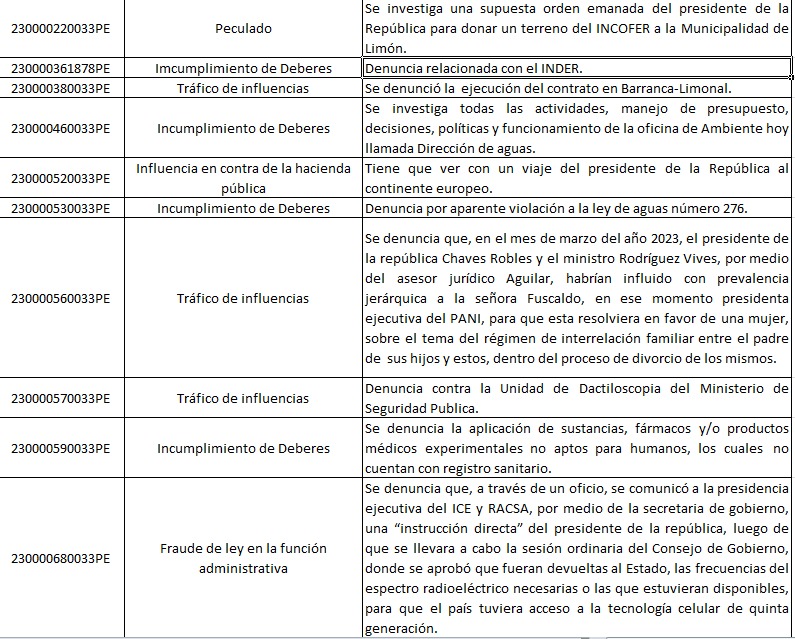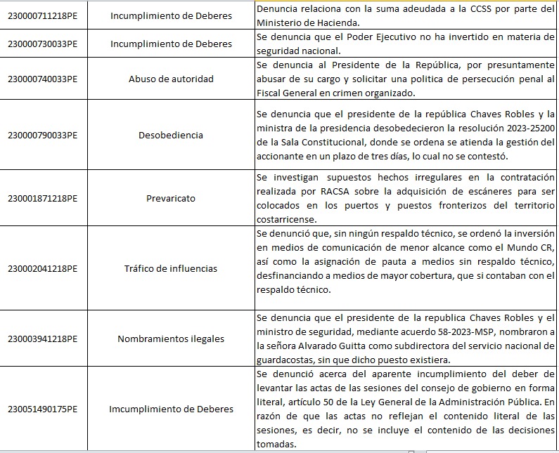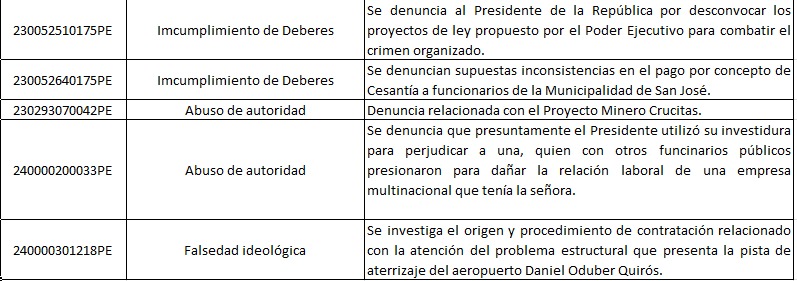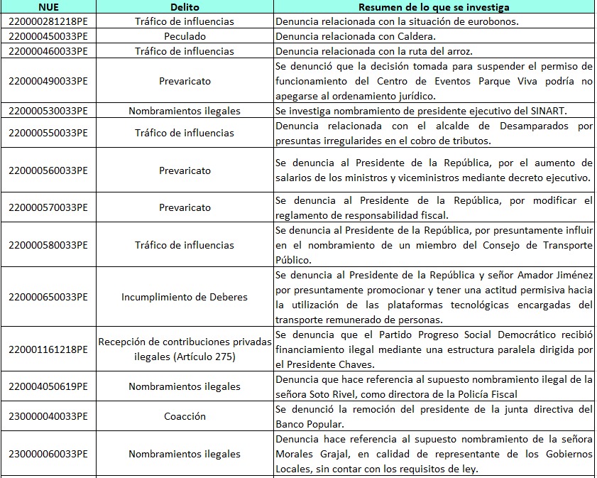 El financiamiento de la campaña, los eurobonos, la Ruta del Arroz, el proceso de contratación de escáneres mediante RACSA, el cierre de Parque Viva, la polémica con Leonel Baruch y el PANI, la distribución de pauta publicitaria, la desconvocatoria de proyectos para combatir la inseguridad ciudadana y un caso por actas del Consejo de Gobierno figuran en la lista.