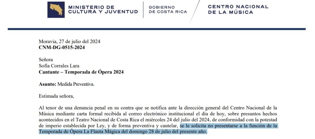 El 27 de julio, el director del Centro de la Música envió una nota a la cantante Sofí Corrales en la que le solicitó, de forma preventiva y cautelar, no presentarse a la función de la Temporada de Ópera «La Flauta Mágica» del domingo 28 de julio. En el documento, del cual Noticias Columbia tiene copia, Chaves dijo que la decisión se tomó debido a la notificación de una denuncia penal en contra de la artista por hechos ocurridos el 24 de julio en el Teatro Nacional.