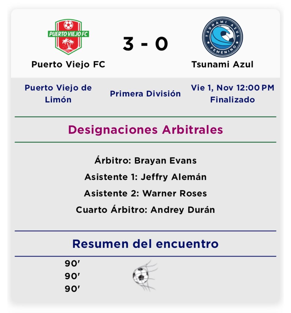 Ante la no presentación de Tsunami Azul, se aplica al Artículo 47 del Reglamento de Competición, de la no presentación de un club a un juego oficial y se acreditan los tres puntos con marcador de 3-0 al conjunto de Puerto Viejo FC.