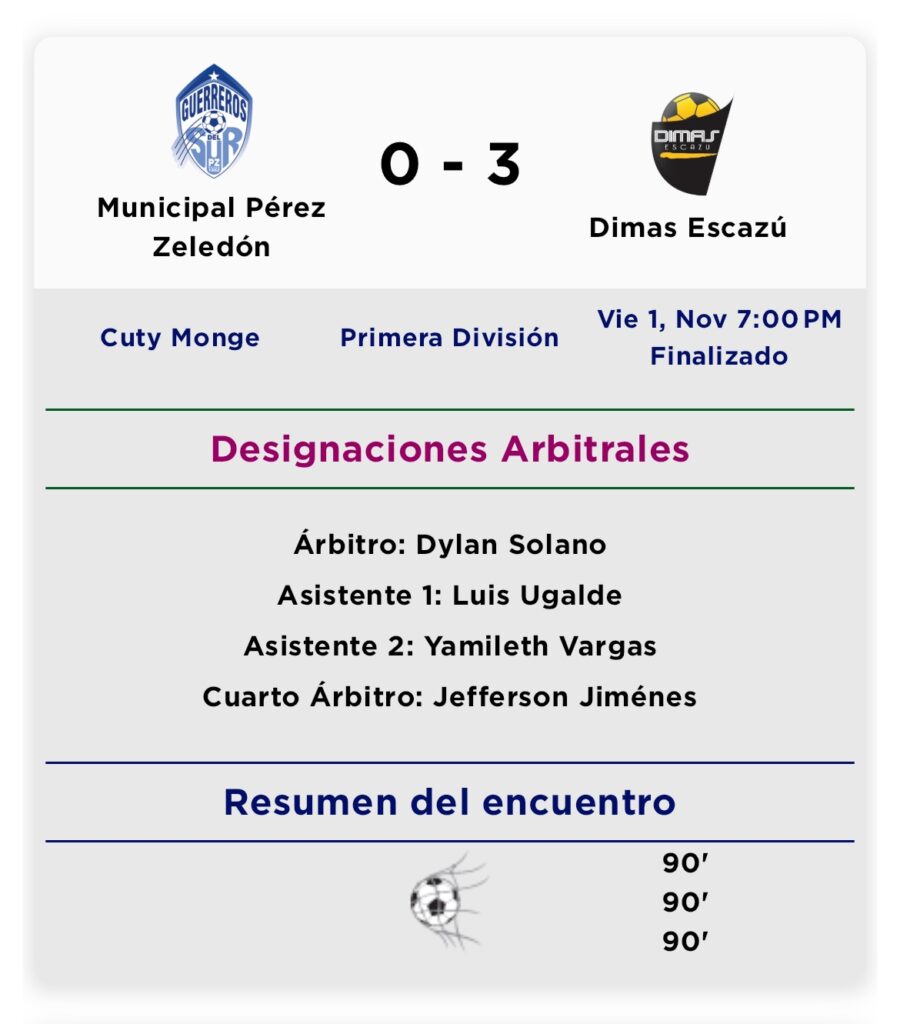 Ante la no presentación de Municipal Pérez Zeledón, se aplica al Artículo 47 del Reglamento de Competición, de la no presentación de un club a un juego oficial y se acreditan los tres puntos con marcador de 3-0 al conjunto de Dimas Escazú.