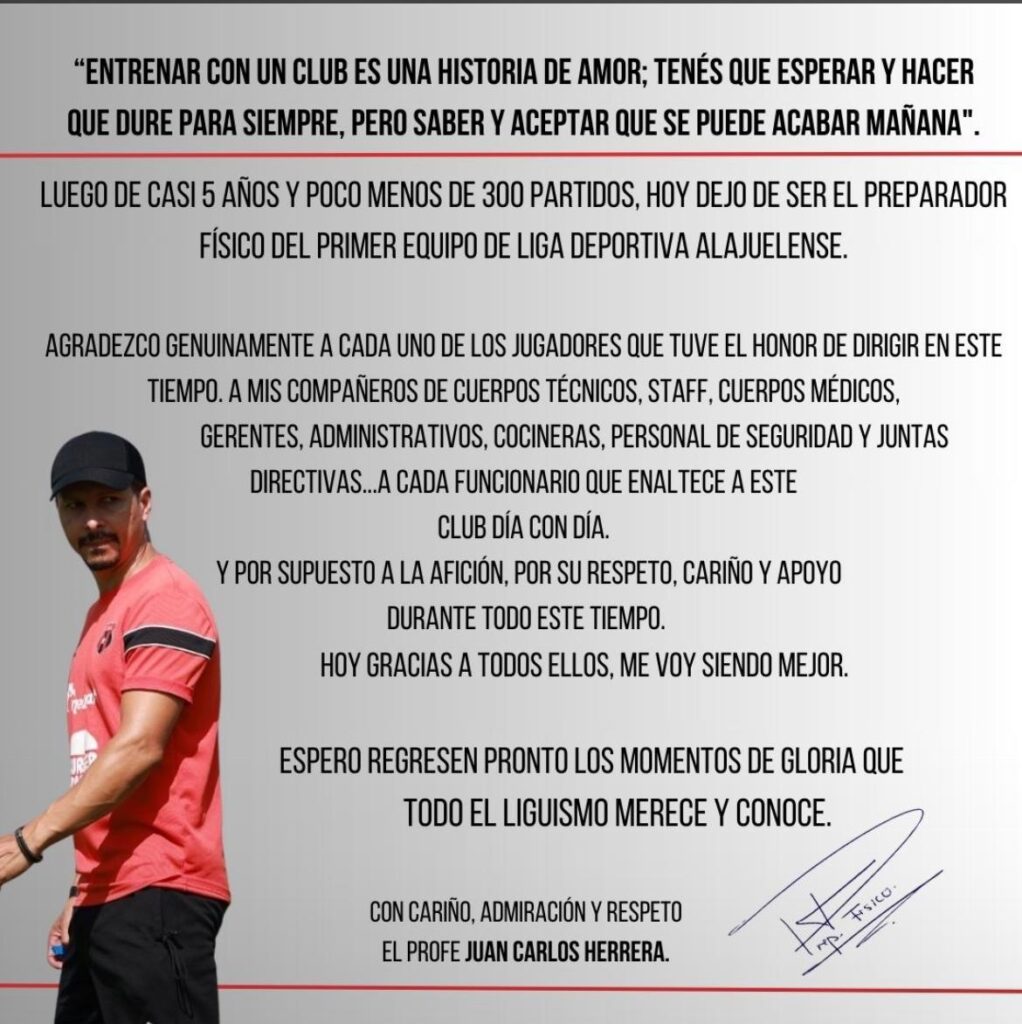 Tras la confirmación de la salida del entrenador Andrés Carevic y sus asistentes Mario Acosta y Martín Arriola; este lunes por la noche se sumó el preparador físico Juan Carlos Herrera. ‘La casa quedó limpia’ para la llegada en las próximas horas de Alexandre Borges Guimaraes con su gente de confianza.