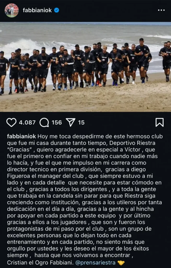 Fabbiani se despidió de Riestra después de la última derrota ante Sarmiento en Junín, resultado que lo privó de acomodarse en la Zona B del Torneo Apertura 2025. La campaña del Malevo igualmente es más que considerable, ya que ganó 4, empató 2 y perdió 3, por lo que se mantiene firme en zona de clasificación a octavos de final. A través de las redes sociales, los de Pompeya anunciaron confirmaron a Gustavo Tata Benítez como DT interino.
