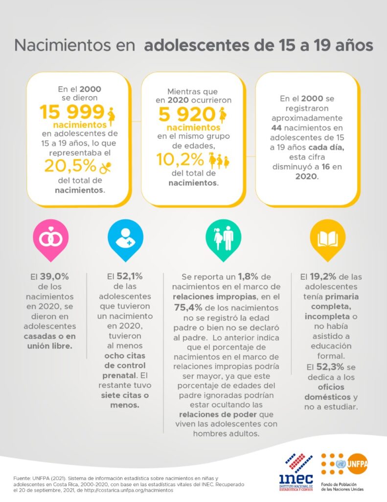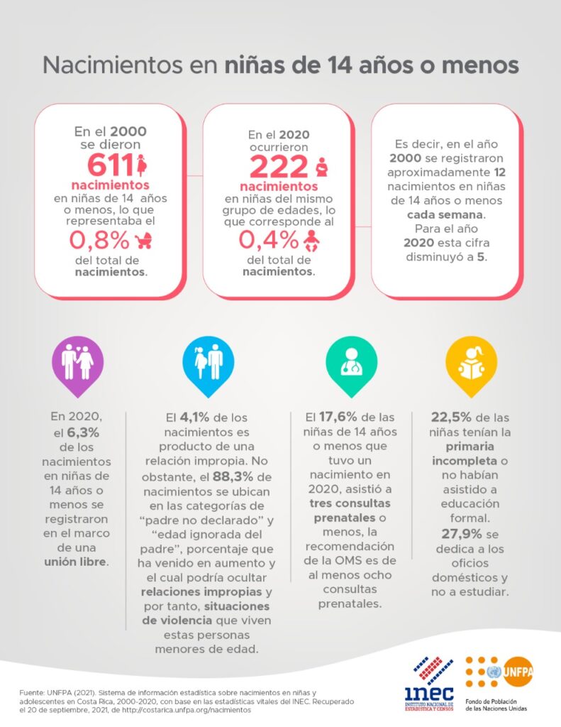 Sobre Costa Rica, los datos de UNFPA e INEC revelan que en el año 2000 se registraron aproximadamente 12 nacimientos cada semana en niñas de 14 años o menos; para el año 2020 esta cifra disminuyó a 5 para un total de 22 nacimientos.