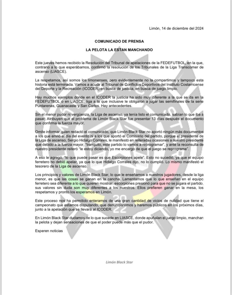 Limón Black Star no se quedó de brazos cruzados y emitió su propio comunicado: