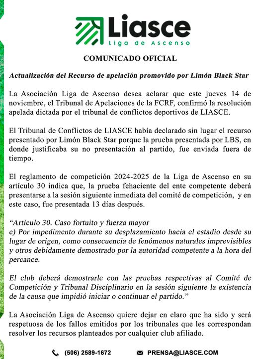 El Tribunal de Apelación de la Federación Costarricense de Fútbol ordenó a la Liga de Ascenso revertir la adjudicación hasta no conocer a fondo el recurso de revocatoria y apelación presentado por Black Star. Esto ya ocurrió y se determinó que los limonenses actuaron a destiempo: