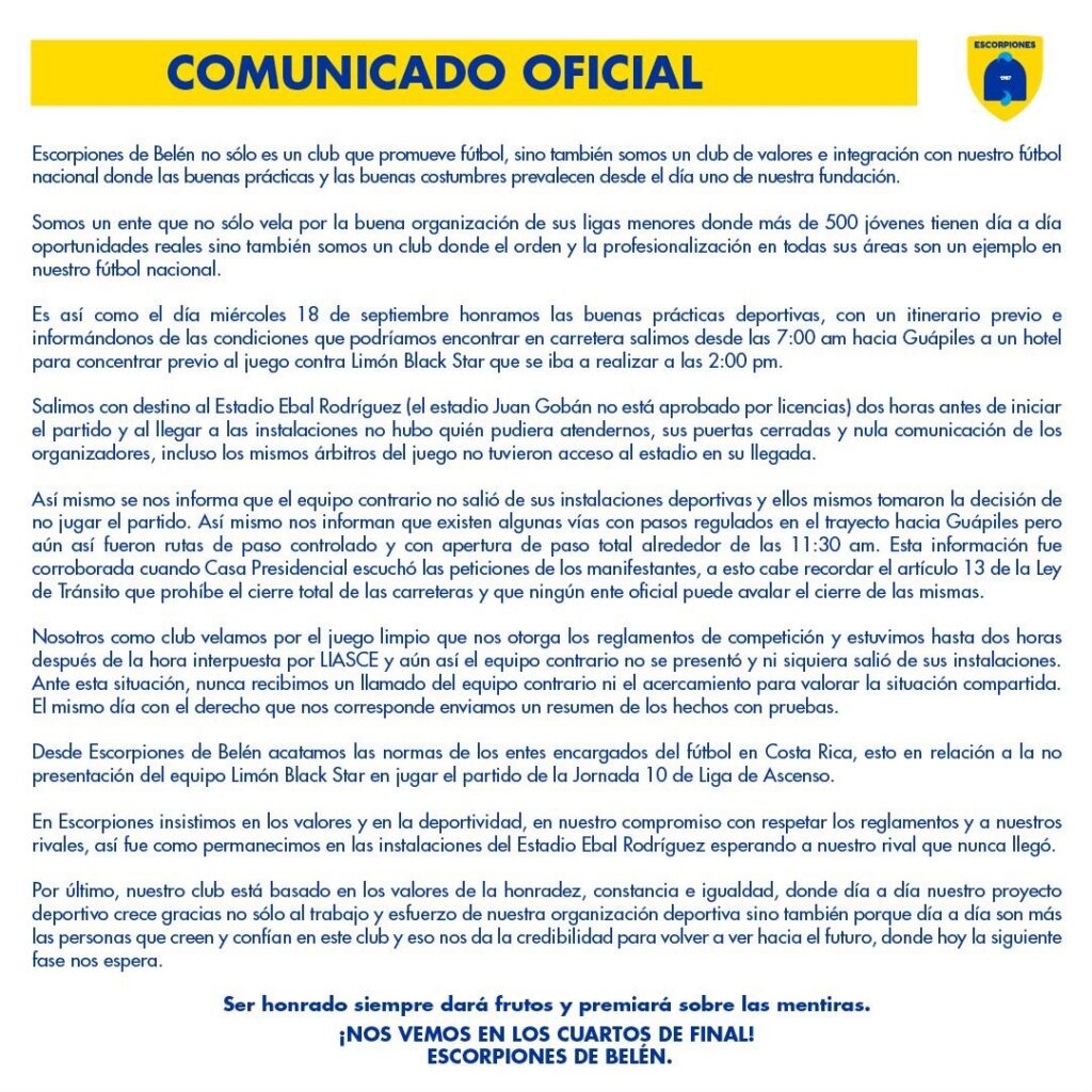 El Tribunal de Conflictos y Apelaciones de la Liga de Ascenso resolvió darle los 3 puntos de la fecha 10 al club Escorpiones de Belén por no presentación de Limón Black Star.