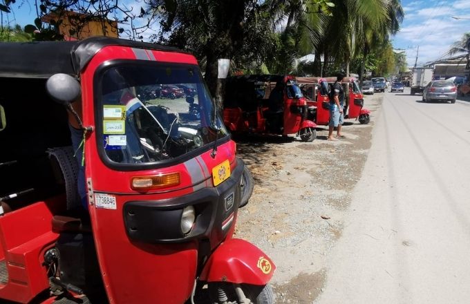 En Puerto Viejo es constante el movimiento de las moto-taxis, conocidas como Tuk-Tuks. Son vehículos adaptados para el transporte de pasajeros.