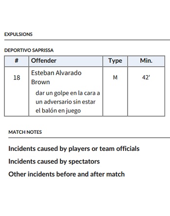 En el caso de Mariano Torres, quien empujó al asistente William Chow, por lo cual tan solo fue amonestado… Solo se consigna que fue por «protestar airadamente».