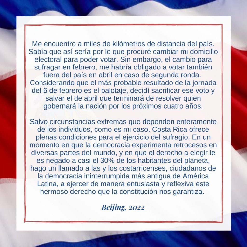 “En un momento en que la democracia experimenta retrocesos en diversas partes del mundo, y en que el derecho a elegir le es negado a casi 30% de los habitantes del planeta, hago un llamado a los costarricenses, ciudadanos de la democracia ininterrumpida más antigua de América Latina, a ejercer de manera entusiasta y reflexiva este hermoso derecho que la constitución nos garantiza”, finalizó.