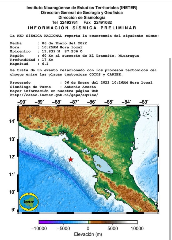 Medios nicaragüenses como La Prensa reportaron el epicentro en el Pacífico de ese país y con una magnitud de 6.1. Este fue el informe que publicó el medio en su versión digital.
