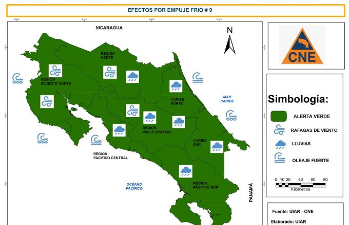 El Instituto Meteorológico Nacional (IMN) informó que hay un aumento de la presión atmosférica, tanto en Centroamérica como el Mar Caribe, provocado por el empuje frío #9. Esto genera vientos alisios muy fuertes en la región, registrándose ráfagas de viento de hasta 107 Kilómetros por hora (km/h) en La Cruz y 96 km/h en el Volcán Orosi.