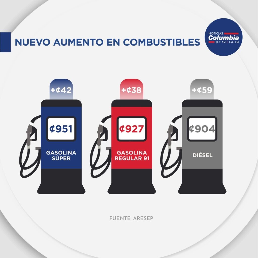 El incremento será de 42 colones en la súper, 38 colones más en la regular o plus y 59 en el diésel.