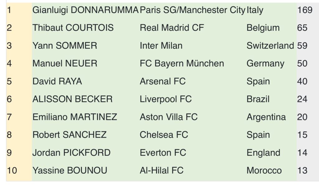 Sumó 169 puntos para una victoria soberana por delante de Thibaut Courtois, el belga ganador del Premio al Mejor Portero del Mundo de la IFFHS en 2018 y 2022, y del suizo Yann Sommer, quien logró su mejor clasificación histórica.