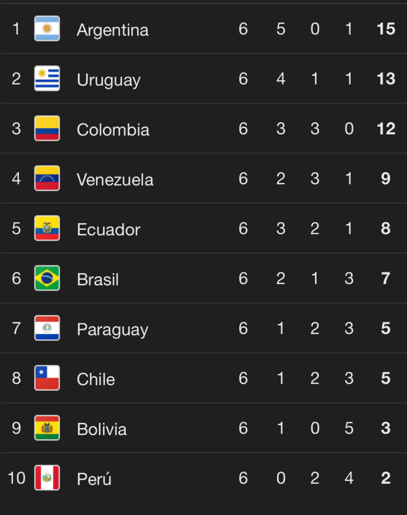 En las eliminatorias sudamericanas clasifican seis selecciones directamente al Mundial y el sétimo va a repechaje. Paraguay ocupa la posición 7 empatado en puntos con el octavo, Chile, dos unidades arriba de Bolivia y tres encima de Perú.