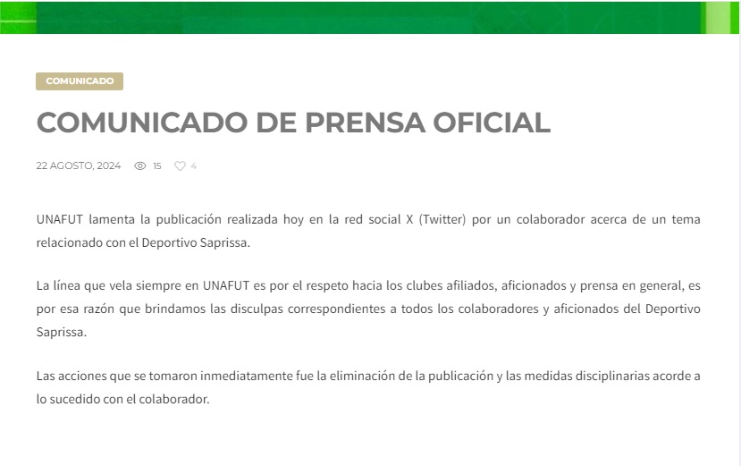 Unafut lanzó un comunicado reconociendo la pifia y ofreciendo disculpas a Saprissa, pero en la misma línea los morados publicaron una furibunda diatriba.
