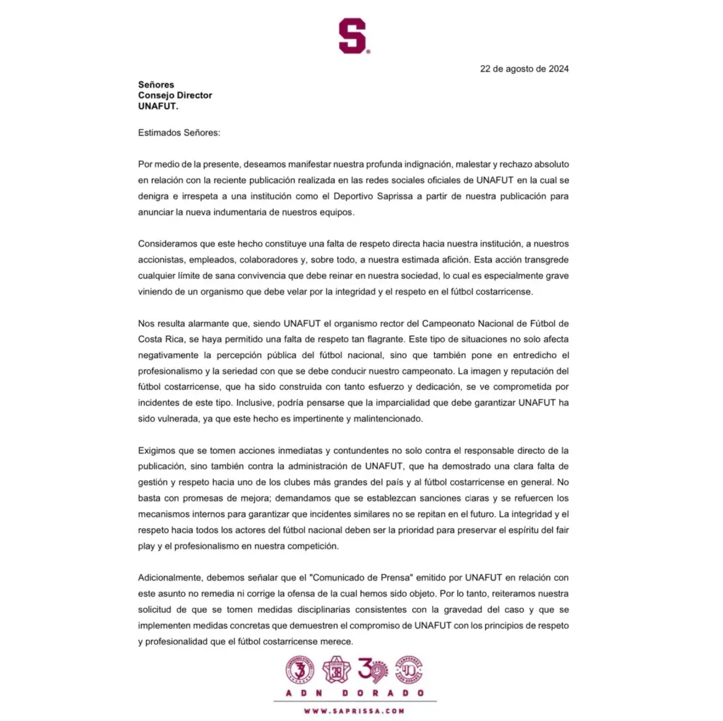 En su carta firmada por Chinchilla, Saprissa aseguró que “la imparcialidad que debe garantizar Unafut ha sido vulnerada, ya que este hecho es impertinente y malintencionado“.