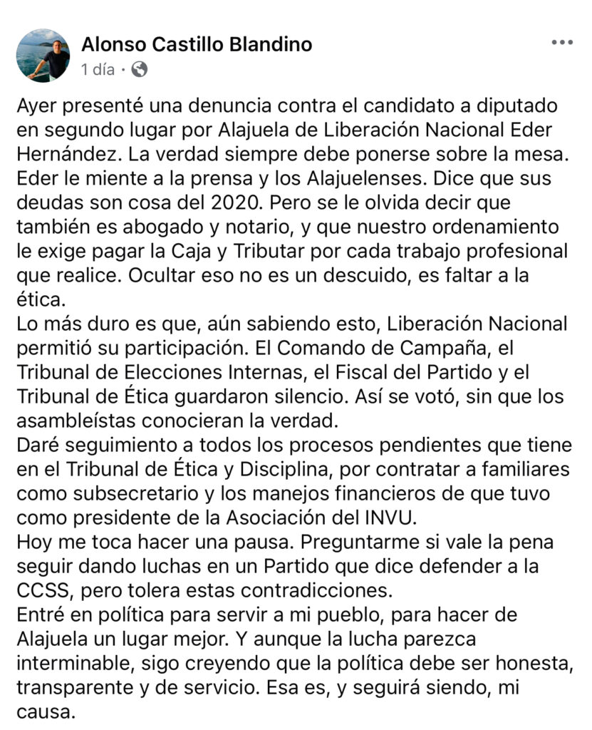 Otro militante que se expresó al respecto fue el regidor alajuelense y delegado en la Asamblea Nacional, Alonso Castillo, quien denunció el sábado que el electo en el segundo lugar por Alajuela, Eder Hernández, tenía deudas con la Caja Costarricense de Seguro Social (CCSS).