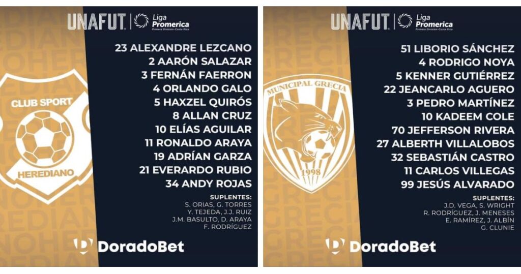 Los heredianos tuvieron varios tiros libres en la frontal del área, sin embargo, no pudieron descontar. Con el 1-3 a favor de los griegos en el marcador, William Mattus concluyó los primeros 45 minutos.