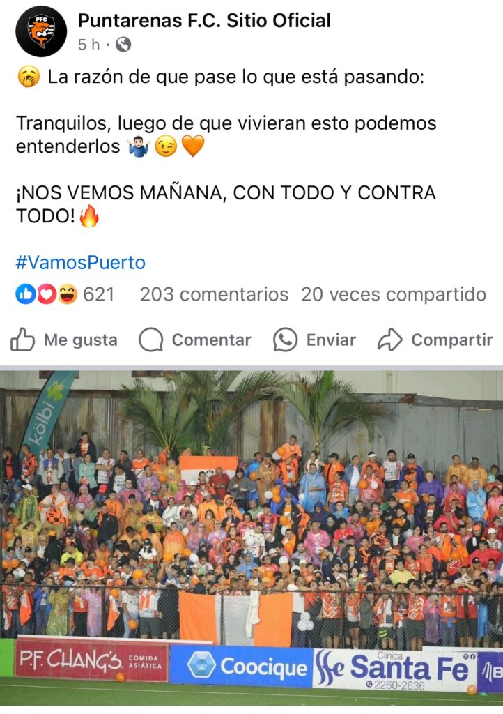 En sus redes sociales Puntarenas respondió con fotos alusivas a un partido de visitantes ante Herediano con muchos porteños en las gradas del “Colleya” Fonseca.