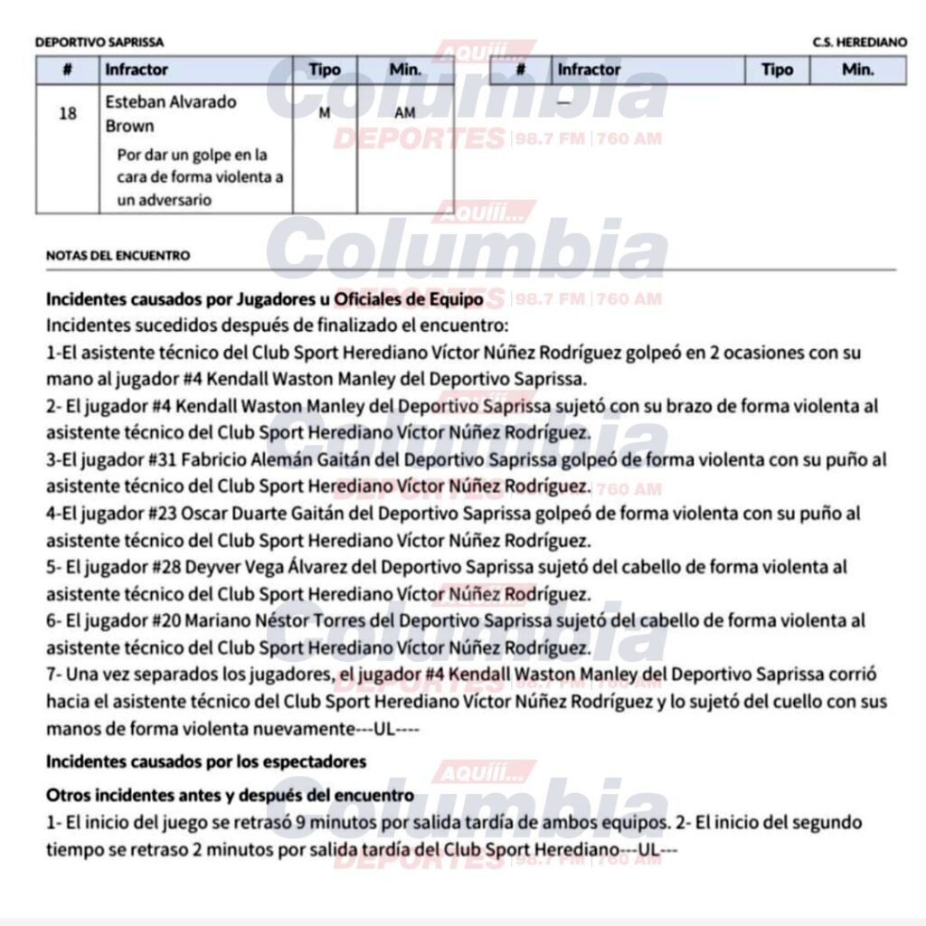 Columbia Deportiva tuvo acceso al informe arbitral del partido Saprissa 2 – Herediano 0, que consigna graves hechos que sin duda acarrearán fuertes castigos.